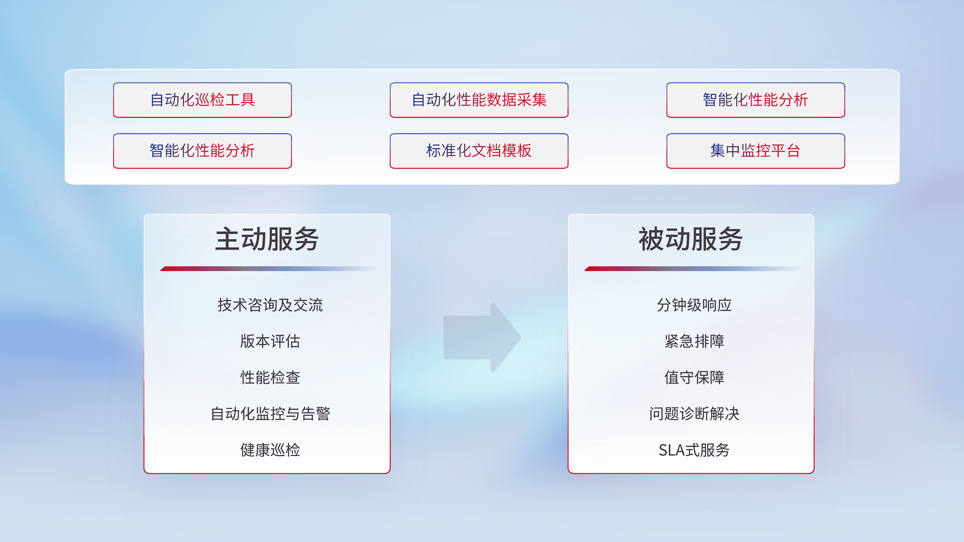 智能化工具和标准化文档,,保障服务质量,,,提供主动服务(包含技术咨询、、版本评估、、、性能检查、、自动化监控与告警、、、、健康巡检)和被动服务包含(分钟级响应、、紧急排障、、值守保障、、问题诊断解决、、、、SLA服务)。。